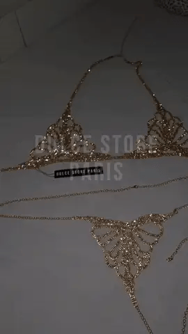 Sube el glamour con un conjunto tan deslumbrante como tú . Esta obra maestra incluye pedrería que captura la luz con cada movimiento, combinada con delicados detalles de cadena para un toque ultraseductor . Diseñado para hacerte brillar, resplandecer y robarte las miradas , porque nada debería brillar más que tú.