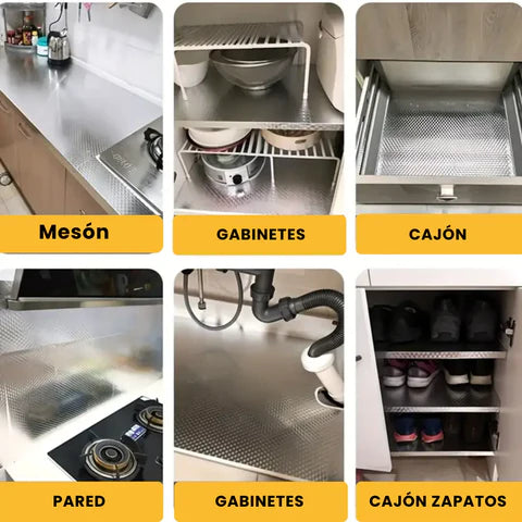 Esta lámina protectora evitará que el calor, humedad, polvo, grasa o el aceite dañen o manchen tu cocina, gabinetes, artefactos, mostradores y paredes, permitiendo de esta manera conservarlos en su mejor estado y alargar su vida útil